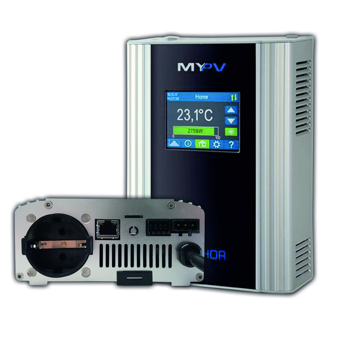 AC-THOR 9s, gestionnaire d’énergie photovoltaïque pour l’eau chaude et le chauffage de la société autrichienne myPV. Produit permettant la gestion d’appareils triphasés jusqu’à une puissance de 9kW.